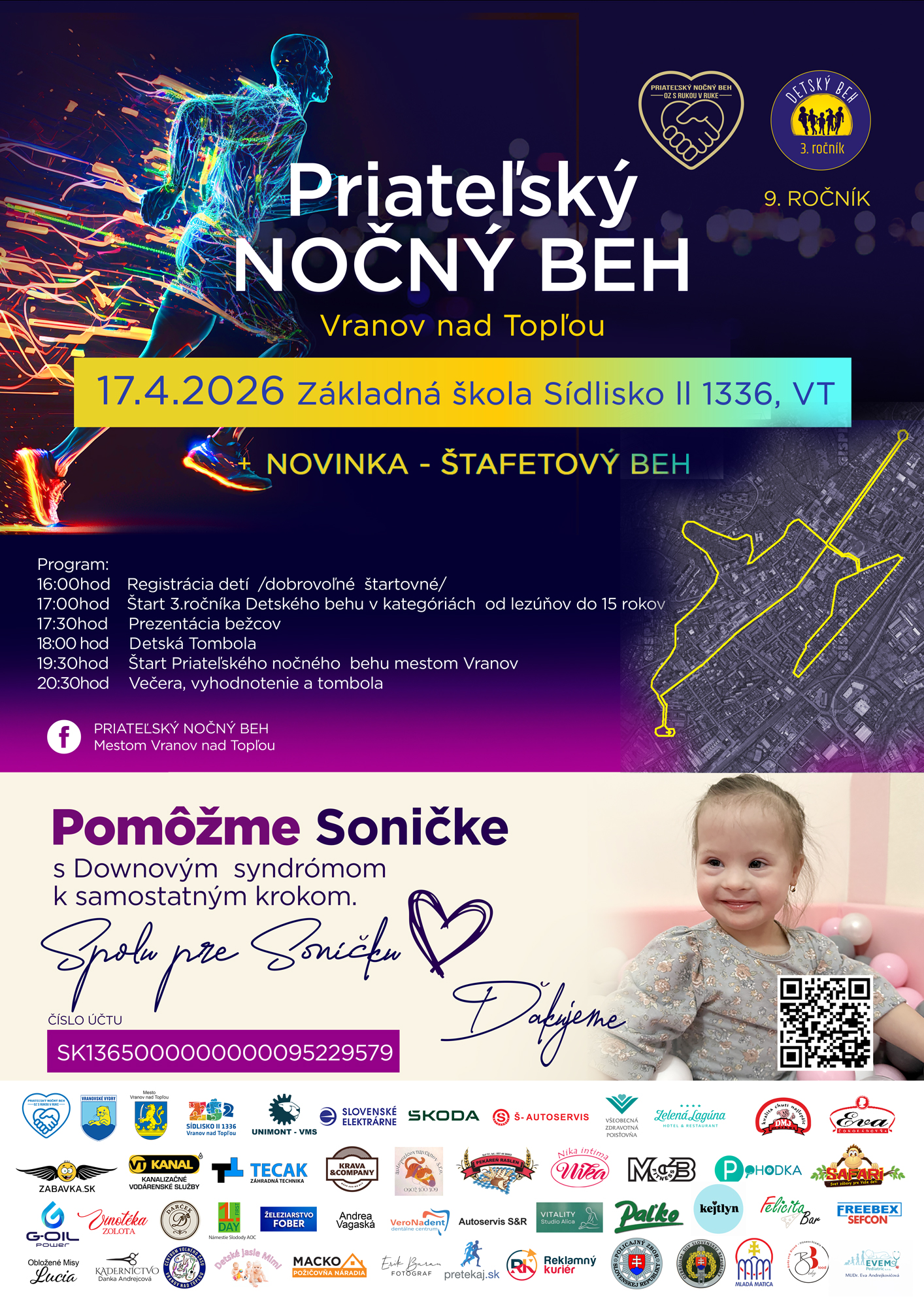V piatok 17. 4. 2026 sa Vranov nad Topľou rozbehá pre dobrú vec! Pripojte sa k 9. ročníku Priateľského nočného behu so štartom pri ZŠ Sídlisko II. Tento rok výťažkom podporíme malú Soničku na jej ceste k samostatným krokom.